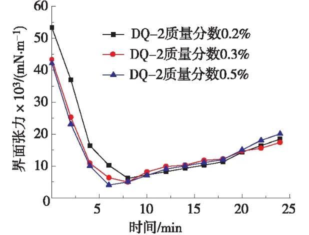 測(cè)定低界面張力表面活性劑DQ-2體系的質(zhì)量分?jǐn)?shù)分別為0.2%,0.3%,0.5%的油水界面張力,不同濃度目標(biāo)體系的油水界面張力隨時(shí)間變化曲線見圖1。