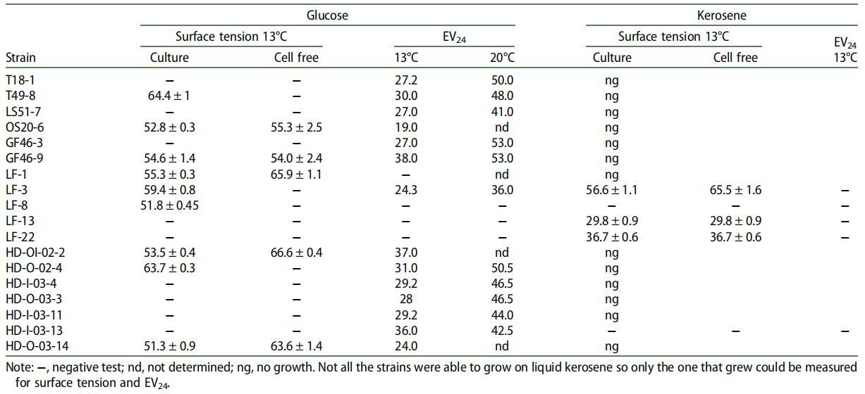 對于 SAC 生產的定量評估,確定了表面張力和乳化活性。 良好的生物表面活性劑應能夠將水或培養基的表面張力降低 ≥20 mN m-1 [13] 或 ≥40 mN m-1。[18] 良好的生物乳化劑的 EV24 值應高于 50%。 19] 在 100 個陽性分離株中,只有 4 個菌株能夠將培養基的表面張力從 72 mN m-1 的未接種培養基降低至少 20 mN m-1(表 1)。 沒有一株分離株的 EV24 值高于 50%,但其中 18 株的 EV24 值≥19%(表 1)。 我們研究中的培養溫度為 13°C,低于之前研究中使用的溫度(28°C),[14,20] 可能影響了受試菌株的乳化活性。 因此,在 13°C 下 EV24 值≥20% 的分離株在 20°C 下培養。 結果證實,較低的生長溫度導致測試培養物的較低乳化活性。 11 個分離株中有 10 個在 20°C 下顯示出 EV24 >40%(表 1)。