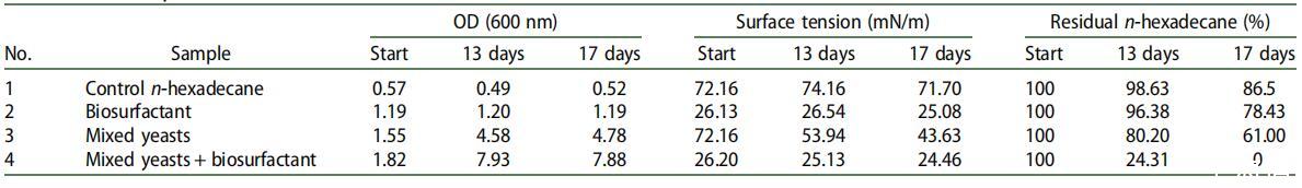 用酵母和生物表面活性劑修飾的樣品 4 表現出最高的 OD 增加,即與起始值相比增加了 4.4 倍,表明酵母在生物表面活性劑存在下生長得更快(表 4)。 正十六烷的降解率從用酵母修正時的 12 毫克/天增加到酵母和生物表面活性劑同時存在時的 30 毫克/天。 在生物表面活性劑存在下 17 天后,正十六烷耗盡。