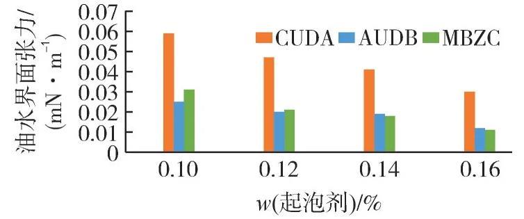 2)在溫度58℃、礦化度7 052.28 mg/L的條件下,CUDA、AUDB和MBZC這3類低界面張力起泡劑的油水界面張力隨著起泡劑濃度的提高而降低,且當起泡劑的質量分數達到0.16%時,AUDB與MBZC型起泡劑的油水界面張力低于0.02 mN/m,具備低界面張力驅油的能力。