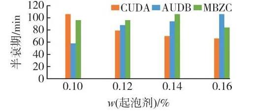泡沫性能直接關系到起泡劑在地層的封堵效果。目前,油田驅油用表面活性劑工業品主要有陰離子型、非離子型和兩性型單獨或復配使用,其泡沫性能差別很大。起泡劑的濃度是影響起泡劑活性的重要因素之一,合理的濃度設置必須使其既具有高效的泡沫特性也具有一定的經濟性,故選擇CUDA、AUDB、MBZC這3種非離子-陰離子型起泡劑,在其質量分數分別為0.10%、0.12%、0.14%和0.16%時,評價這3種起泡劑發泡量、半衰期、泡沫綜合指數等性能。