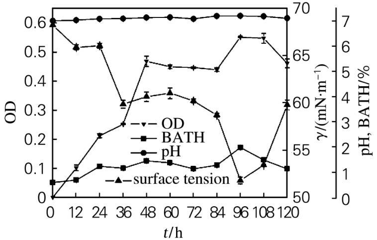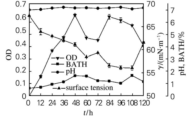 生物表面活性劑產生菌菌體密度、細胞疏水性與發酵液pH及表面張力的關系(二)