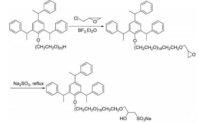 采用“一鍋煮”法制備表面活性劑,合成路線如圖1所示。將一個(gè)帶有機(jī)械攪拌器,回流冷凝管和恒壓滴液漏斗的500 mL三頸瓶置于80℃的恒溫水浴中,先后加入92 g的三苯乙烯苯酚聚氧乙烯醚-25和75 mL的正庚烷,向攪拌后形成的溶液中加入2 mL的三氟化硼乙醚催化劑,用恒壓滴液漏斗滴加過(guò)量的環(huán)氧氯丙烷溶液,滴加完后升溫至90℃反應(yīng)3 h;然后滴加20%NaOH水溶液,維持反應(yīng)體系的pH值在7.5~9,TLC監(jiān)測(cè)反應(yīng)進(jìn)程到原料點(diǎn)消失后結(jié)束反應(yīng)。向產(chǎn)物中加入二甲亞砜,溶解后過(guò)濾除去反應(yīng)中生成的鹽;用正庚烷萃取、水洗后旋轉(zhuǎn)蒸發(fā)除去溶劑;將粗產(chǎn)物溶解于乙醇中,向其中滴加100 mL的25%的亞硫酸鈉溶液,分批加入6 mol/L的鹽酸溶液維持反應(yīng)體系的pH值在7~9,在80℃的恒溫水浴中繼續(xù)反應(yīng)過(guò)夜,將反應(yīng)物用熱的異丙醇萃取后過(guò)濾除去無(wú)機(jī)鹽,將濾液旋轉(zhuǎn)蒸發(fā)除去溶劑得到黃色產(chǎn)物三苯乙烯基聚氧乙烯醚羥丙基磺酸鈉,即為表面活性劑TPHS。