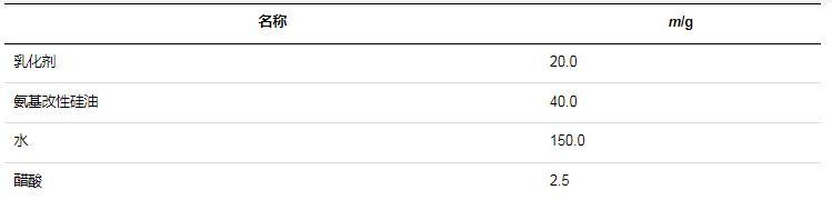 氨基改性硅油在未經(jīng)乳化處理之前,通常為一種油狀或半固態(tài)的物質(zhì),不易與水相混合。而氨基改性硅油柔軟劑需要在水中分散均勻,才能被紡織物充分吸收和利用,發(fā)揮柔軟、抗靜電等作用。因此,上述步驟下制得的氨基改性硅油還需要進(jìn)一步的乳化處理,才能形成氨基改性硅油柔軟劑,否則不能發(fā)揮柔軟劑的作用,反而還會(huì)損傷紡織物。室溫下,將乳化劑、氨基改性硅油、醋酸與水按照一定的比例混合,然后200 r/min攪拌5 min,即可制成氨基改性硅油柔軟劑。乳化方案中各物質(zhì)比例見(jiàn)表1。