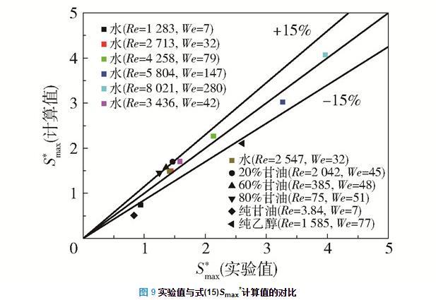 圖9為Smax*實驗值與式(15)的Smax*計算值的對比,式(15)的Smax*計算值與實驗值誤差在大部分情況下都小于15%,因此在75 < Re < 9000,7 < We < 300時,可使用式(15)預測液滴撞擊不銹鋼固體表面的最大鋪展面積。