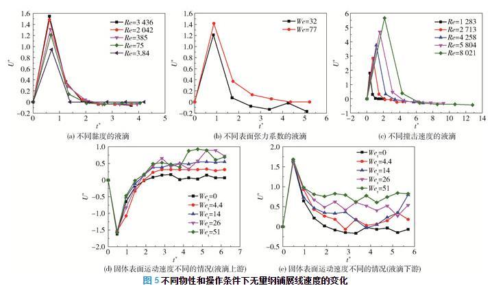 在固體表面水平運動時,定義液滴上游方向為液滴鋪展與固體表面運動相同的方向,反之為液滴下游方向。如圖5(d)所示,液滴上游鋪展線速度(絕對值)在撞擊后的短時間內增加到最大值,但由于其方向與固體表面運動方向相反,隨著固體表面運動速度的增大,液滴受到的黏性力增大,且上游鋪展線速度降低。液滴上游鋪展線速度降至0之后,黏性力與上游鋪展線速度的方向開始相同,此時黏性力作正功,因此固體表面運動速度的增大會使得上游鋪展線速度增大,直至上游鋪展線速度與表面運動速度相等。如圖5(e)所示,在撞擊的瞬間,液滴下游鋪展線速度大于表面的運動速度,此時黏性力做負功,且下游鋪展線速度會逐漸減小至固體表面運動速度。