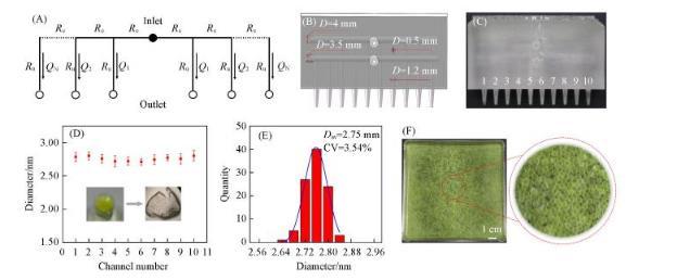 在確定平行放大微流控器件通道結構尺寸設計后,通過SolidWorks建立三維模型,并利用光固化3D打印機直接打印微流控器件。實驗表明,10個并排微流控通道均可以穩定生成水/水微囊,并且所生成的微囊具有較一致的尺寸大小和較均勻的分散性。綜合統計10個微流控通道形成的微囊分布,可以得到D=(2.75±0.10)mm.在10個平行微流控通道設計下,水/水微囊的產率可以達到0.5 kg/h,并可依據相同原理,進一步增加平行通道的數量,提高產率,實現尺寸均一水/水微囊的高通量制備。