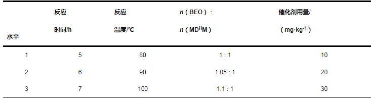 (1)以三氯化釕為催化劑,BEO和MDHM為原料,成功合成了目標產物BEOTSS;采用正交試驗優化了催化反應條件:催化劑用量30 mg/kg,n(BEO)∶n(MDHM)為1.05∶1,反應時間6.0 h,反應溫度100℃,在此工藝條件下MDHM轉化率可達99%。