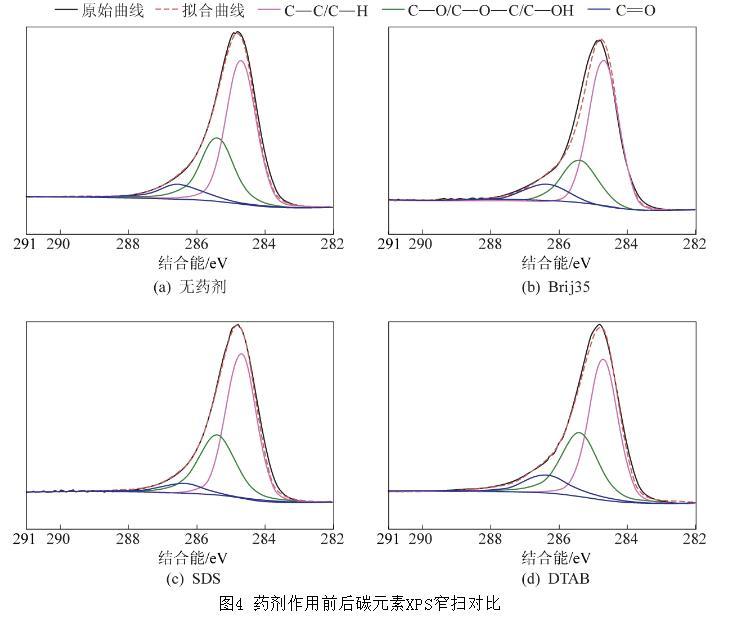 選取不加藥濾餅和3種表面活性劑最佳藥劑量下的濾餅進行XPS測試。表4為4個樣品表面元素的XPS寬掃分析的結果。從XPS寬掃結果可以看出,與3種藥劑作用后,煤樣表面的C元素含量有所減少,O元素含量有所增加。并且,SDS作用后煤樣表面S元素含量顯著增加,DTAB作用后N元素含量顯著增加,出現這一變化的原因在于SDS的親水端中含有S元素,DTAB的親水端中含有N元素,由于煤樣表面較多的疏水性位點被表面活性劑的非極性端吸附,極性端指向外端。XPS寬掃結果與接觸角的測量結果相吻合,即煤表面與表面活性劑作用后,親水性增強,接觸角減小。
