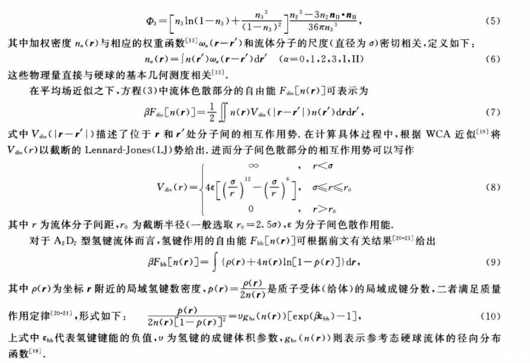 在微擾論的框架下,體系的過量自由能Fex[n(r)]可被表示為硬球、色散和氫鍵作用3部分的貢獻(xiàn)之和,形式如下: