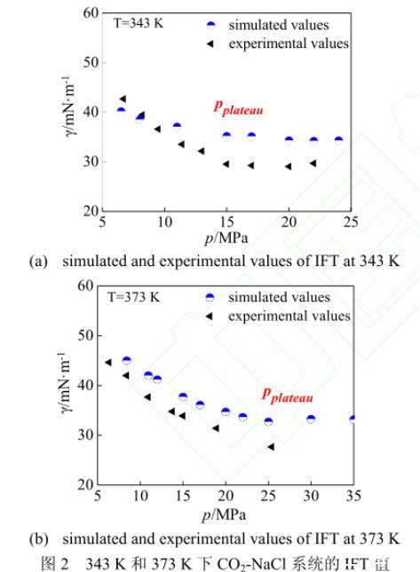本文分別模擬了343 K和373 K的各壓強(qiáng)下鹽濃度為1.89 mol·L-1的CO2-NaCl系統(tǒng),IFT的計(jì)算結(jié)果示于圖2。由圖2可以看出,模擬所得的IFT值與Chalbaud等的實(shí)驗(yàn)數(shù)據(jù)吻合較好。在溫度為343 K時(shí)[圖2(a)],IFT值隨著壓強(qiáng)的不斷升高,其減幅逐漸下降,最終在壓力平衡點(diǎn)pplateau=15 MPa之后達(dá)到穩(wěn)定值34 mN·m-1。373 K時(shí)[圖2(b)]的IFT值變化與343 K時(shí)極為相似,IFT值同樣隨著壓強(qiáng)的升高而下降,且下降速度不斷趨于平緩,由于高壓情況下實(shí)驗(yàn)設(shè)備等因素受限制,實(shí)驗(yàn)方法尚未得到25 MPa以上的數(shù)據(jù)點(diǎn),故在實(shí)驗(yàn)壓強(qiáng)范圍內(nèi)并未觀測(cè)到壓力平衡點(diǎn)。而本文應(yīng)用分子模擬的方法,成功模擬了25~35 MPa下的CO2-NaCl系統(tǒng),觀測(cè)到壓強(qiáng)在pplateau=25 MPa之后達(dá)到穩(wěn)定值33 mN·m-1。