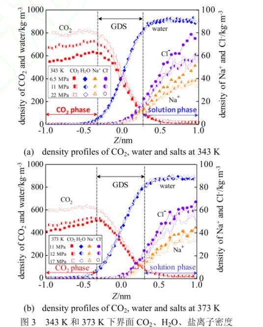 為從分子角度更加詳細(xì)地描述界面性質(zhì)的變化,本文選取并計(jì)算了界面處2 nm厚度區(qū)域的CO2、H2O、Na+及Cl-的密度,結(jié)果示于圖3。由圖3可以觀測(cè)到:當(dāng)從CO2相向溶液相過渡時(shí),CO2密度逐漸下降,H2O密度則逐漸上升;而鹽離子密度則從界面中心向溶液相,由0逐漸達(dá)到某一穩(wěn)定值。由圖3可以看出,溫度一定時(shí),CO2在CO2相的密度隨著壓強(qiáng)的升高逐漸升高。由[圖3(a)]可以看出,溫度為343 K時(shí),當(dāng)壓強(qiáng)由6.5 MPa升高至22 MPa,CO2相的CO2密度從580 kg·m-3升高至800 kg·m-3左右;而溫度為373 K時(shí)[圖3(b)],當(dāng)壓強(qiáng)由11 MPa升高至17 MPa,CO2相的CO2密度從約420 kg·m-3升高至600 kg·m-3左右。此外,對(duì)比圖3(a)和(b)還可知,當(dāng)壓強(qiáng)恒定在11 MPa時(shí),溫度由343 K升高到373 K,CO2相的CO2密度則由700 kg·m-3降至420 kg·m-3左右。