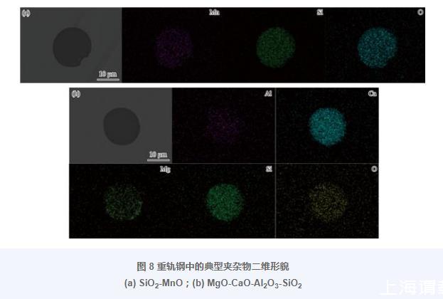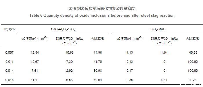 分析鋼渣反應前后夾雜物的成分可知,重軌鋼中氧化物夾雜分為SiO2-MnO系和CaO-Al2O3-SiO2系兩類夾雜,圖8所示為兩類典型夾雜二維形貌。各類氧化物夾雜在鋼渣反應前后數量密度變化見表6。可以看出,鋼中主要夾雜為鈣鋁硅酸鹽,因此鋼渣反應30 min后,鈣鋁酸鹽的去除率同總氧化物夾雜的去除率相近,隨著氧、硫質量分數的增高,鈣鋁酸鹽的去除率呈升高的趨勢。由于鋼中硅錳夾雜數量較少,且掃描面積有限,僅從以上表格統計的數量密度不具代表性,因此其去除率未呈現明顯規律。