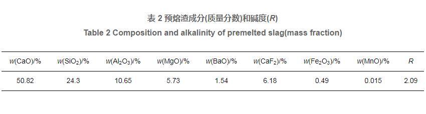 研究鋼液中氧含量對夾雜物去除的影響時,需待試驗鋼熔清后加入質量分數為99%的Fe2O3以提高鋼中氧元素質量分數。所加試劑熔化且均勻后(反應10 min),立即抽取石英管樣1并水冷,隨后向鋼中加入提前預熔粉碎好的渣料(渣量為鋼液質量的15%),成分見表2。鋼渣反應30 min后取石英管樣2并水冷。