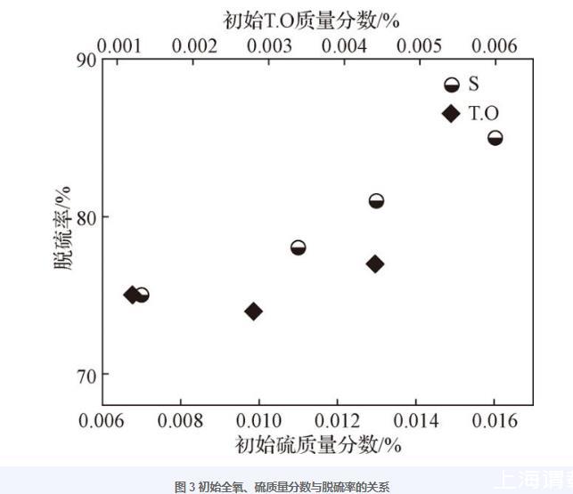 檢測每爐試樣1和試樣2的硫和全氧質量分數,結果見表3。可以看出,固定鋼中全氧質量分數,隨著初始硫質量分數的升高,鋼渣反應30 min后,脫硫率逐漸增大,且穩定在74%以上,終點硫質量分數可降低到0.002 6%以下;固定鋼中硫質量分數,隨著初始全氧質量分數的升高,終點全氧質量分數可降低到0.001 4%以下,終點硫質量分數可降低到0.001 8%以下,皆滿足重軌鋼的成分要求。鋼中初始硫、全氧質量分數與脫硫率的關系如圖3所示。