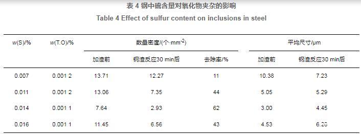在鋼液中,氧、硫是最常見的表面活性元素。當這些元素在熔融鋼液中的質量分數增加時,鋼-渣的界面張力和夾雜物與鋼液之間的界面張力會迅速減小。鋼渣反應前期,由于鋼中初始氧、硫含量高,活度也高,夾雜物與鋼液的界面張力較低,隨著脫硫、脫氧反應的進行,界面張力增大。因此在30 min的鋼渣反應過程中,界面張力、接觸角等一直在動態變化。本試驗將鋼液初始氧、硫質量分數調整到一定值后,隨著鋼渣反應發生和脫氧產物在鋼液中運動上浮,鋼中硫含量、溶解氧含量是變化的,因此選取相同時間段的2個固定時刻,即同批鑄坯溶清鋼液在增氧/硫10 min和鋼渣反應30 min,可以對比整個反應過程不同初始氧、硫元素對重軌鋼中氧化物夾雜去除的影響。