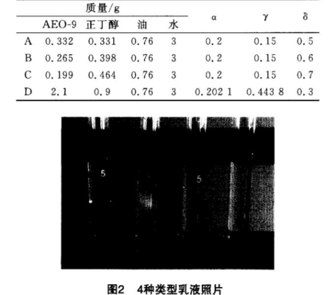 由圖1可見,在所配制的乳液中,既有均相乳液,也有兩相(上相、下相)乳液,同時有三相(中相)乳液。在選擇典型體系時,應體現出全面性,即以上4種類型乳液都涉及到,同時應考慮到漸變性,即固定某個變量(此處固定γ),一種相態向另一種相態轉變。由此,選出其中4組:A(下相乳液)、B(中相乳液)、C(上相乳液)、D(均相乳液),A、B、C、D的組成如表1所示,形成的乳液照片如圖2所示。分別將乳液部分分離出來,稀釋成質量分數為0.1%、0.3%、0.5%、1.0%的微乳液。