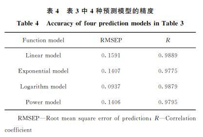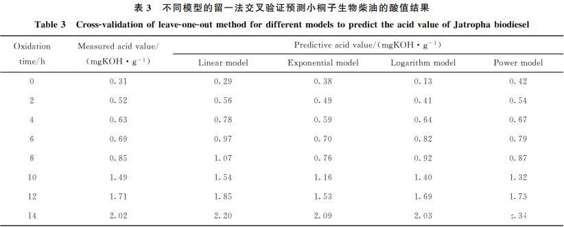 留一法交叉驗證是建立預測模型的一種常用方法,從N個觀測數(shù)據(jù)中選擇一個觀測數(shù)據(jù)作為驗證數(shù)據(jù),然后使用剩下的(N-1)個觀測數(shù)據(jù)擬合一個模型,并用驗證數(shù)據(jù)來驗證模型的精度,如此重復N次。考慮到數(shù)據(jù)量以及相關性,筆者利用Excel建立了線性、指數(shù)、對數(shù)、乘冪4種預測模型,對小桐子生物柴油酸值的預測結果見表3。