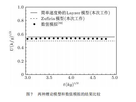 最后,我們將兩種理論模型的結果與數值模擬進行了比較,如圖7所示。在誤差允許的范圍內,Zufiria模型和Layzer模型與數值模擬符合的都很好。由簡單速度勢的Layzer模型得出的結果更接近于數值模擬。另外,從圖7中還可以看出,簡單速度勢的Layzer模型計算值比數值模擬結果高,而Zufiria模型比數值模擬低。這可能由于Zufiria模型假設速度勢是復數勢,會人為引進速度的耗散,導致結果比數值模擬低,而Layzer模型的計算值略高于數值模擬的原因可能由于數值模擬沒有達到漸近速度。