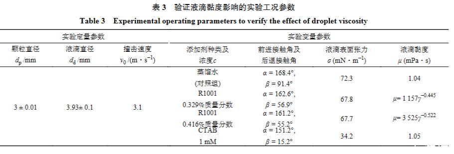 因此,碰撞速度v0設(shè)為3 m/s,液滴直徑dd設(shè)為4 mm。v0的大小通過液滴顆粒之間的豎直高度來設(shè)定,具體計算式為v0=√ ̄2gH,其中g(shù)為重力加速度,H為豎直高度,數(shù)值為40 cm。由于實驗誤差,v0測量值為3.1 m/s,dd測量值為3.93±0.1 mm。詳細的條件參數(shù)設(shè)置見表3。使用高速攝像機記錄樣品顆粒上剩余的附著液體量。
