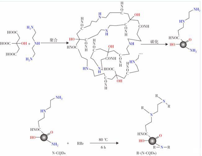 方法 在水熱條件下,以檸檬酸作為碳源、二乙烯三胺為氮源合成了碳量子點(CQDs)和氮摻雜碳量子點(N-CQDs);通過烷基化反應(yīng)對制備出的N-CQDs進(jìn)行表面改性,得到一種兩親性表面活性物質(zhì)R-(N-CQDs)。