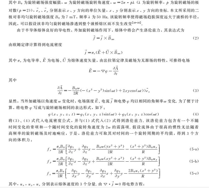 基于浮區法晶體生長中非均勻旋轉磁場對流控制研究工作鮮有的現狀,為了進一步完善外加旋轉磁場對浮區熔體的對流控制的理論研究,筆者引用了有限長-α模型的思想,建立了三維磁流體動力學模型,研究了微重力下外加二極對非均勻旋轉磁場對浮區熔體表面張力對流的控制作用。