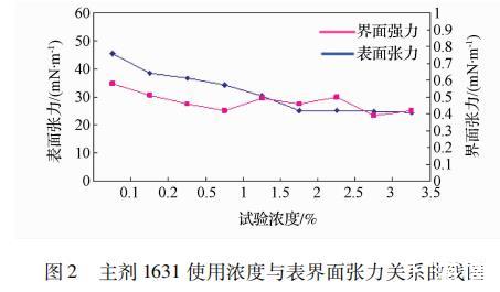圖2 主劑1631使用濃度與表界面張力關(guān)系曲線圖