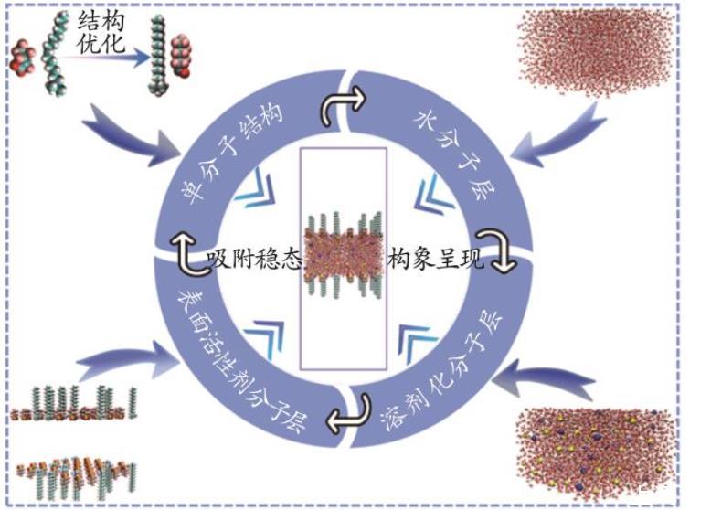 短氟碳鏈復配體系的MD模擬研究依賴于嚴謹的建模、精確的力場參數化與模型選擇及合理的模擬設置。在體系建模階段,初始結構構建可借助高效工具完成:PACKMOL基于迭代算法組裝復雜界面體系(如表面活性劑單層/脂質雙層),Moltemplate支持高度自定義拓撲結構參數化輸出,CHARMM?GUI則提供網頁化界面,簡化溶液/膜界面模型的搭建流程。模型建立的流程如圖3所示。