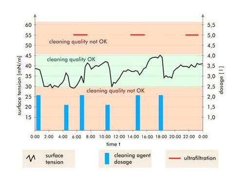 以上案例,通過連續對表面活性劑動態表面張力的監測,清晰可靠地得知清洗池的表活性劑濃度的情況,以此反映清洗池的清洗能力。可根據數據補充適量表面活性劑,保證穩定的清洗效果,從而達到清洗工藝的最優化。