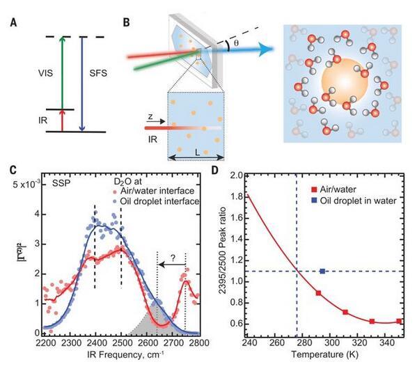 氫的疏水性代表了一種基本的物理性質(zhì),它決定了水介質(zhì)中的各種過(guò)程,如蛋白質(zhì)折疊、自組裝和聚集。亞微米級(jí)疏水油滴或水微粒是了解疏水作用機(jī)理的重要模型系統(tǒng)。然而,這些界面的電荷和結(jié)構(gòu)都有很大的爭(zhēng)議。雖然電荷轉(zhuǎn)移模型表明水是油滴電荷存在的關(guān)鍵,但油滴旁邊的水的結(jié)構(gòu)同樣存在爭(zhēng)議。因此,疏水液體材料旁邊的水的結(jié)構(gòu)仍然是未知的。