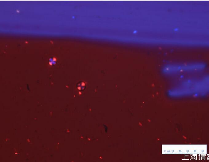 紅色的部分為墨水殘余物的涂片,藍紫色是載玻片本身在偏光鏡下的顏色。圖中可以看到兩個標準的馬耳他十字,基本上能夠驗證“sheen是結晶導致”這一說法