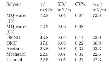 下表列舉了幾種廣為人知的溶劑的表面張力數(shù)據(jù)來闡述了Kibron傳感器的準(zhǔn)確性和精確性,每種溶劑都連續(xù)測定5次并且利用常規(guī)的統(tǒng)計學(xué)方法來分析相關(guān)數(shù)據(jù)。對表面張力的均值進(jìn)行了一個比較,結(jié)果和文獻(xiàn)值是相一致的。